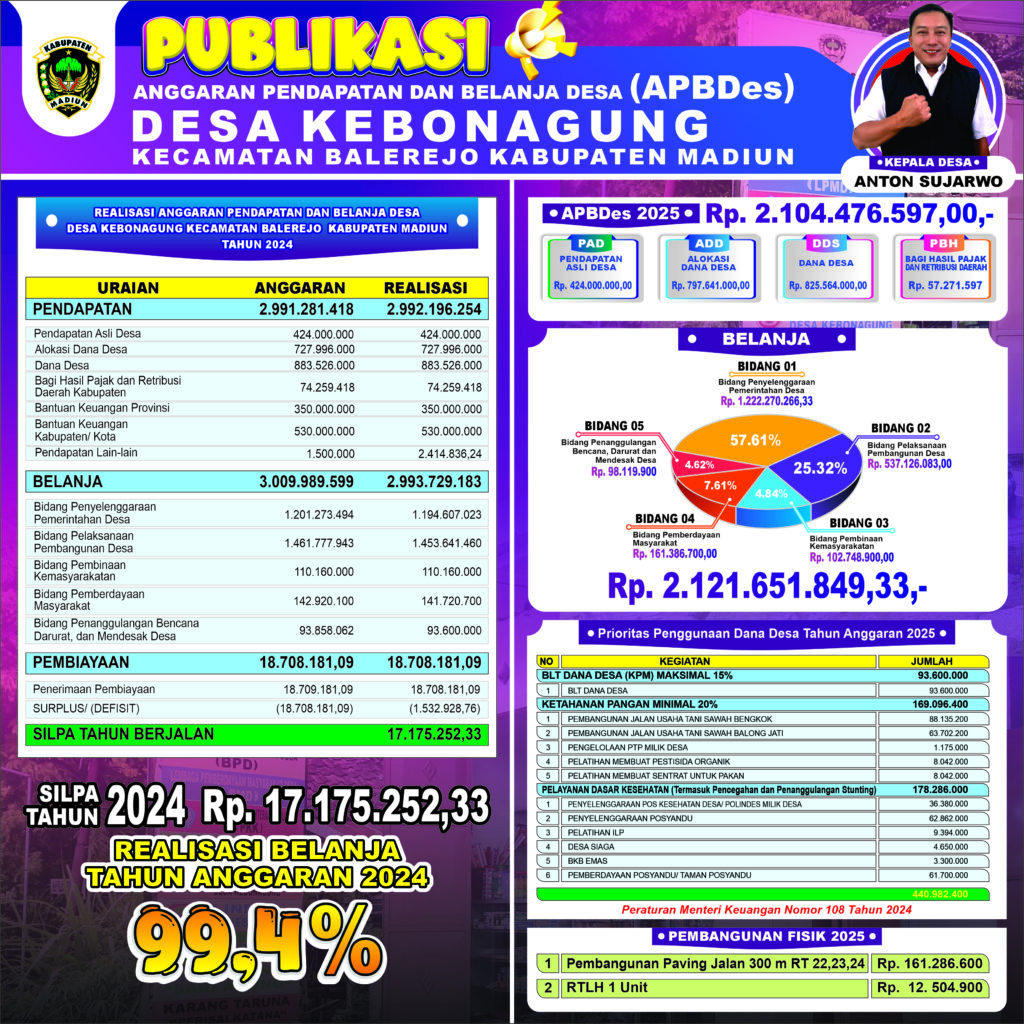 Pada tahun 2024, Pemerintah Desa Kebonagung telah melaksanakan berbagai program pembangunan dan pemberdayaan masyarakat sesuai dengan Rencana Kerja Pemerintah Desa (RKP Desa) yang telah ditetapkan. Kegiatan tersebut meliputi pembangunan infrastruktur desa, seperti perbaikan jalan lingkungan, rehabilitasi saluran irigasi, dan pembangunan fasilitas umum yang bermanfaat bagi warga. Selain itu, berbagai program pemberdayaan masyarakat juga dijalankan, seperti pelatihan keterampilan bagi pemuda, penguatan peran PKK, peningkatan kapasitas kader kesehatan, serta dukungan terhadap UMKM desa yang terus berkembang. Seluruh kegiatan ini berjalan dengan partisipasi aktif masyarakat dan pengawasan dari BPD, sehingga tercipta transparansi dan akuntabilitas dalam pelaksanaannya. Dengan adanya laporan kegiatan 2024 dan penyusunan APDes 2025 ini, diharapkan seluruh elemen masyarakat Desa Kebonagung dapat bersama-sama mendukung jalannya program pembangunan. Semangat kebersamaan, gotong royong, dan partisipasi warga menjadi kunci keberhasilan menuju Desa Kebonagung yang maju.