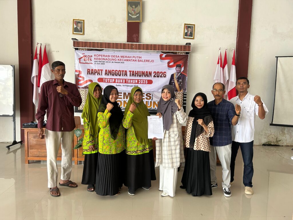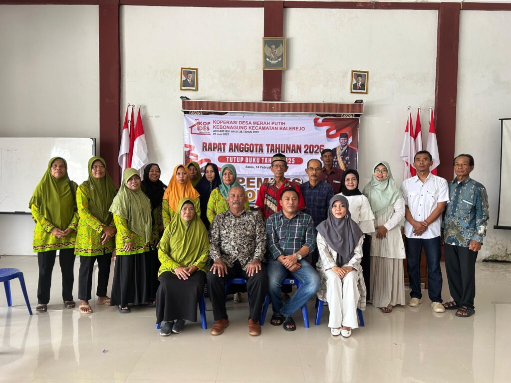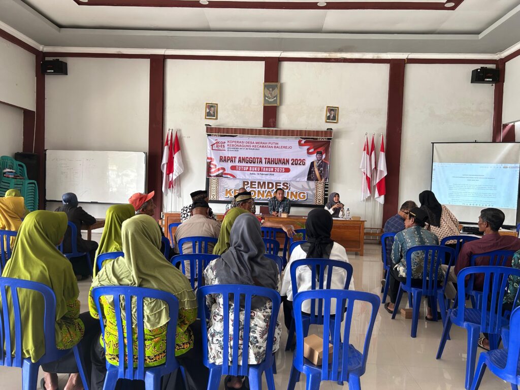 Desa Kebonagung, Kecamatan Balerejo, Kabupaten Madiun, menggelar Rapat Akhir Tahun Koperasi Desa Merah Putih pada hari Sabtu, 14 Februari 2026, bertempat di Balai Desa Kebonagung. Kegiatan ini dihadiri oleh dinas koperasi, pengurus dan pengawas koperasi, anggota koperasi, serta perwakilan Pemerintah Desa Kebonagung. Rapat akhir tahun ini dilaksanakan sebagai bentuk pertanggungjawaban pengurus kepada seluruh anggota atas pengelolaan koperasi selama tahun buku 2025. Dalam forum tersebut disampaikan laporan keuangan, laporan perkembangan unit usaha, serta evaluasi kinerja pengurus dan rencana kerja untuk tahun 2026. Ketua Koperasi Desa Merah Putih dalam sambutannya menyampaikan bahwa koperasi harus terus berkembang dan mampu menjadi penggerak ekonomi masyarakat desa. Transparansi, profesionalitas, dan partisipasi aktif anggota menjadi kunci utama dalam memperkuat kelembagaan koperasi agar semakin mandiri dan berdaya saing. Sementara itu, Pemerintah Desa Kebonagung memberikan apresiasi atas kinerja pengurus koperasi yang telah berupaya maksimal dalam mengelola usaha dan meningkatkan kesejahteraan anggota. Diharapkan ke depan Koperasi Desa Merah Putih dapat semakin solid, inovatif, serta mampu membuka peluang usaha baru yang bermanfaat bagi masyarakat Desa Kebonagung. Rapat berlangsung dengan suasana musyawarah dan kekeluargaan, serta menghasilkan beberapa keputusan penting sebagai pijakan dalam menjalankan program kerja koperasi pada tahun mendatang. Navigasi pos Monitoring dan Evaluasi Bantuan Keuangan Khusus Desa Kebonagung